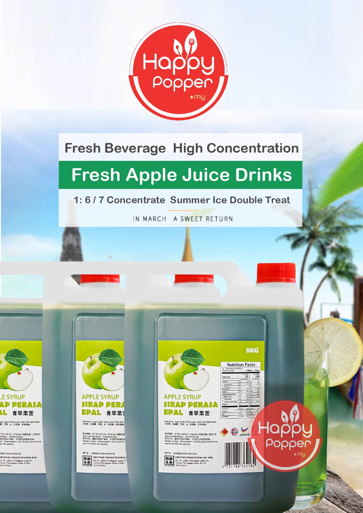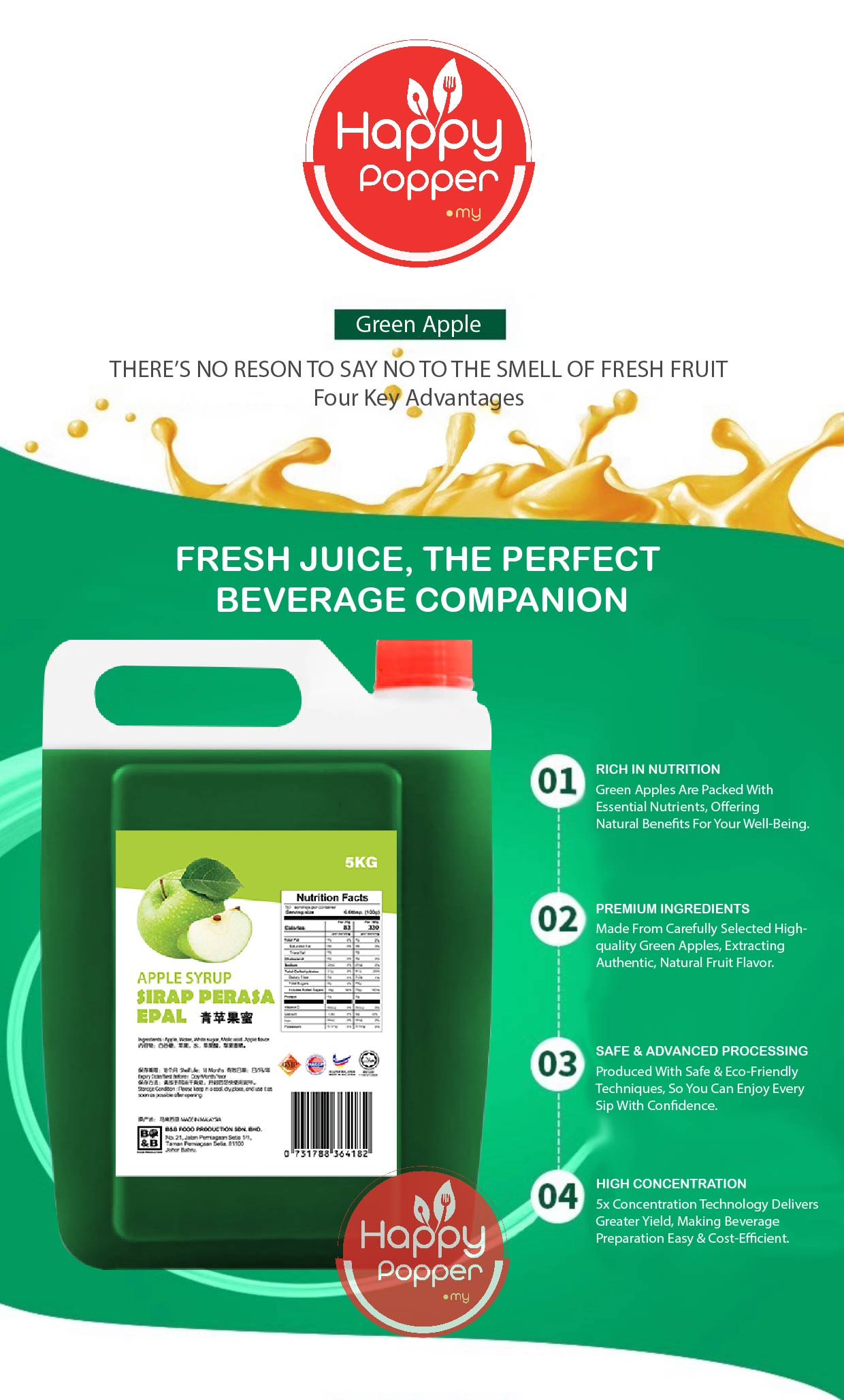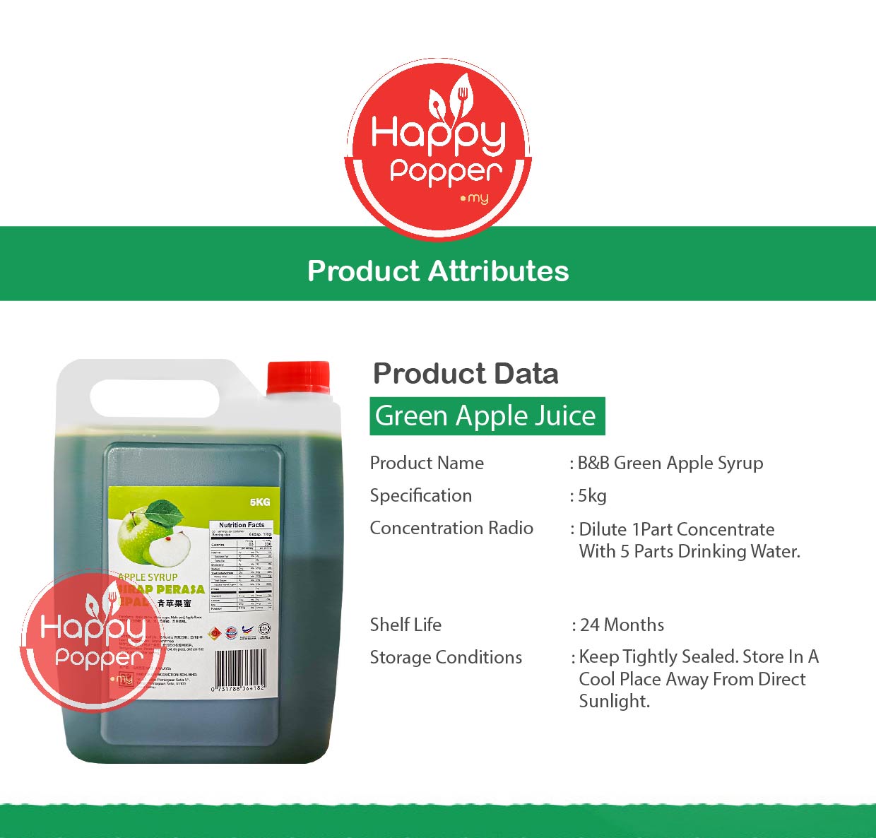 B&B Concentrated Fruit Syrup Green Apple 5kg ( 4 Btl/Ctn ) BT-SY128 青苹果味糖浆5公斤装